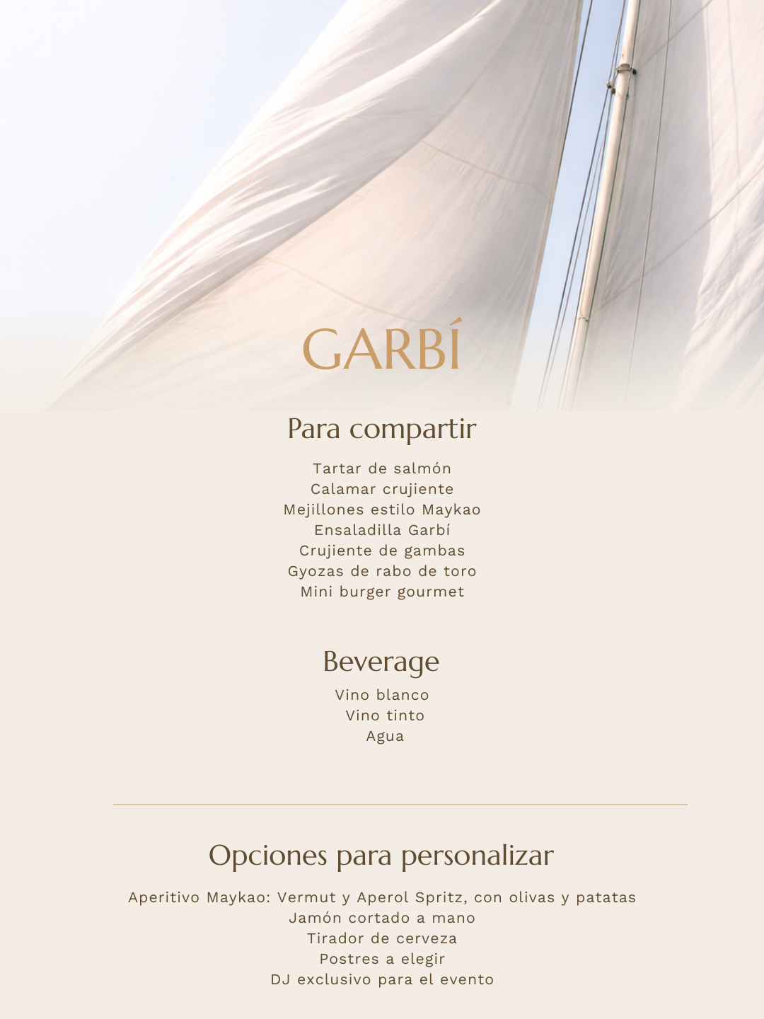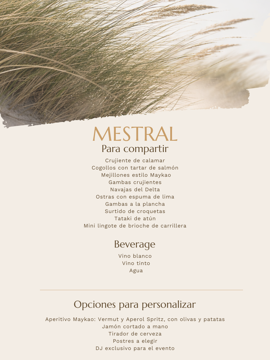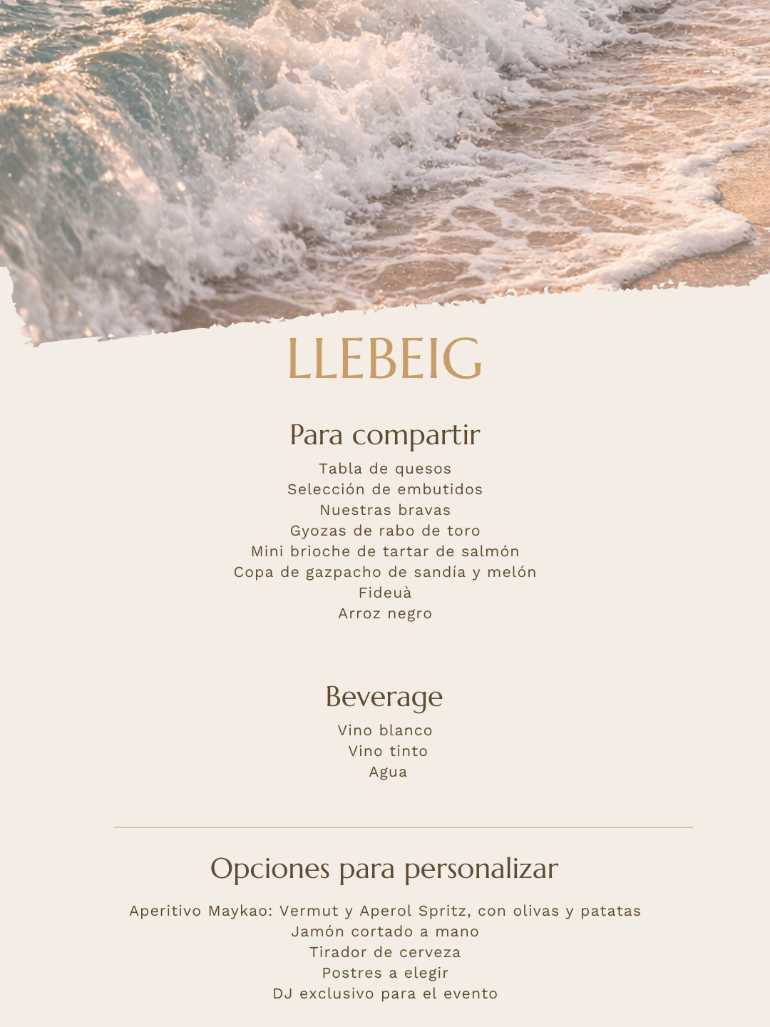 Cada casament, diferent. Dissenyada per a vosaltres: platja com a escenari, estètica i detalls únics al vostre estil, cuina definida per a l'ocasió i una barra a l'alçada del moment.