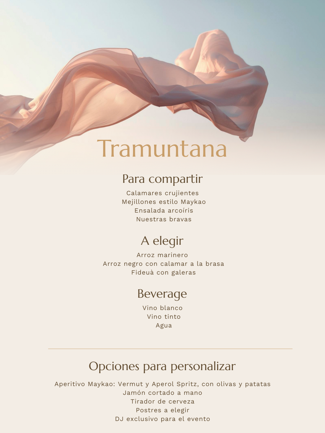 Partim de quatre menús com a base i els ajustem al que necessites. Ritme de l’esdeveniment, estil, preferències del grup i necessitats alimentàries. T’escoltem, et proposem i ho deixem tancat amb claredat.